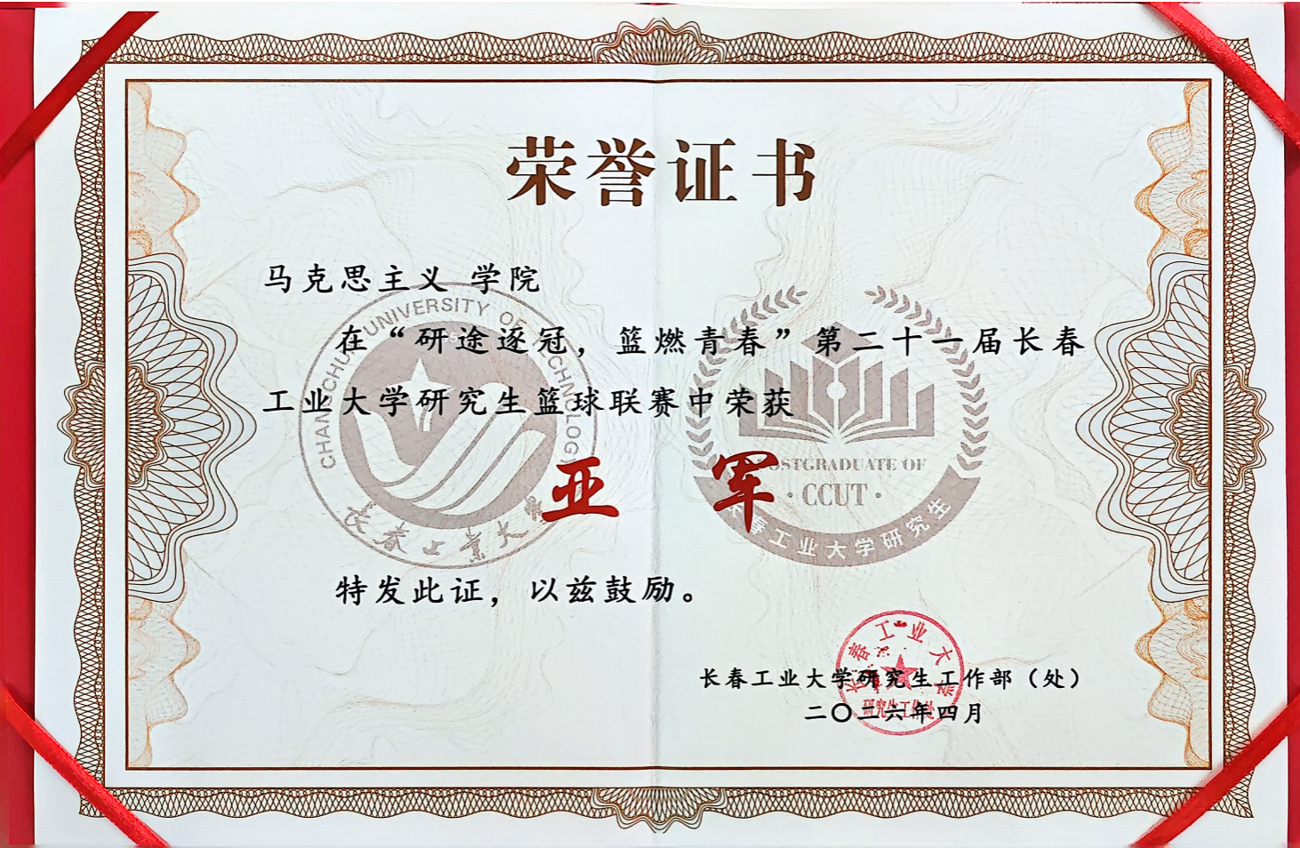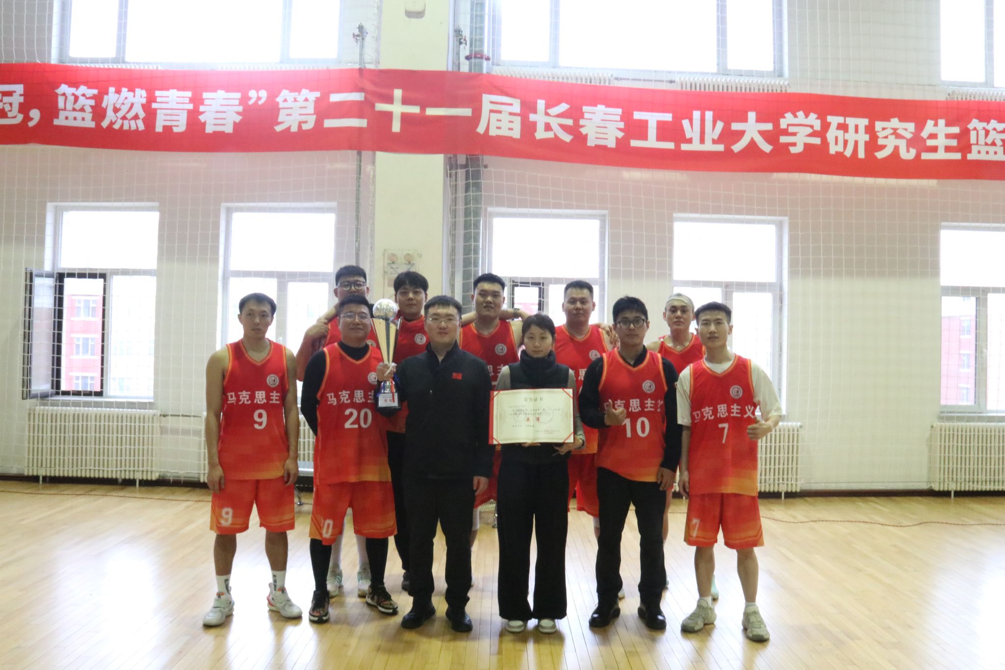 此次联赛于3月30日火热开赛,历时半月有余,共有全校10支研究生队伍参与角逐。回首本届赛事的征程,面对不同风格的劲旅,马院男篮立足于严密的防守,用积极的奔跑补位、果断的篮板拼抢和默契的传导协同,化解了一次次危机。赛场上,带球突破的步伐如疾风、坚如磐石的防守似铁壁,外线远投的利落出手划破长空,内线禁区的激烈拼抢点燃全场。无论场上比分如何焦灼,队员们始终每球必争、永不言退。而在场下,紧密配合的后勤保障与马院啦啦队更是球队最坚实的后盾。这块亚军奖杯,不仅是球员们实力的证明,更是全院上下齐心协力、团结一致的生动缩影。