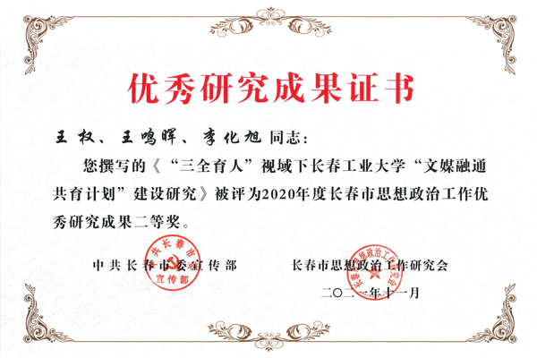 本网讯(通讯员 李化旭)近日,中共长春市委宣传部、长春市思想政治工作研究会下发《关于表彰2020年度长春市思想政治工作优秀研究单位和优秀研究成果的决定》,由日韩无码 党委副书记王权主持撰写的《“三全育人”视域下日韩无码 “文媒融通共育计划”建设研究》荣获二等奖。