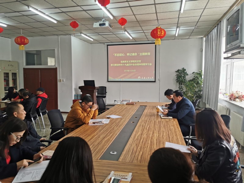 党总支在学院资料室开展“不忘初心,牢记使命”主题教育,专题学习党的十九届四中全会精神。会议由党总支书记朱兴国主持,全院教师参加学习。
