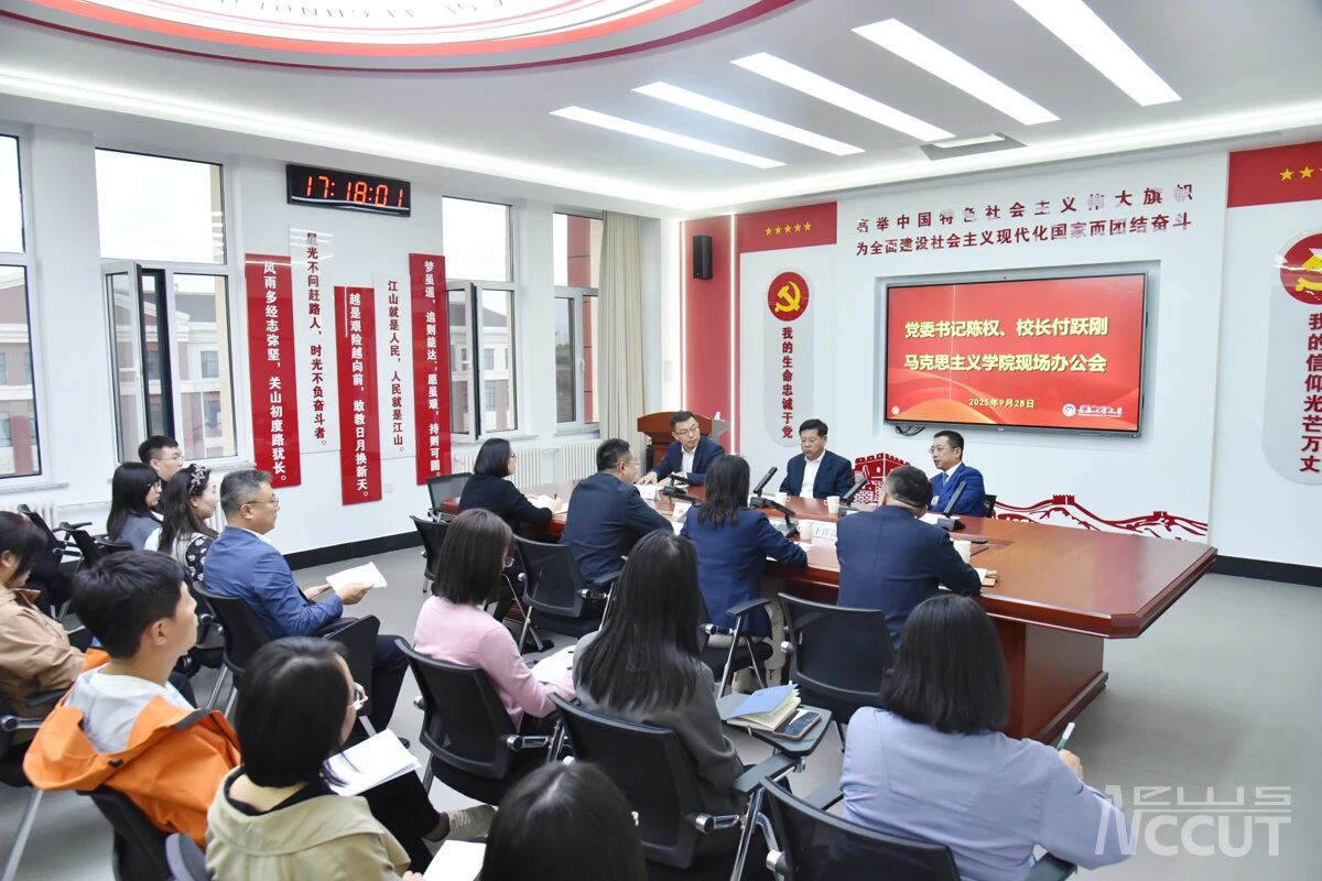 的教学设施与创新平台,先后走访了智慧教室、多功能教室、报告厅等教学场所,重点调研了“学习强国”思政教育创新空间、红途印记互动馆、薪火之路体验馆、学习强国星火书堂等思政教育新载体。学校领导深入各教研室、研究机构、办公室,与学院师生进行亲切交流,细致询问大家在学习、工作及生活等方面的具体情况,勉励师生们立足岗位、勤勉钻研,为马克思主义理论教学研究贡献智慧与力量。