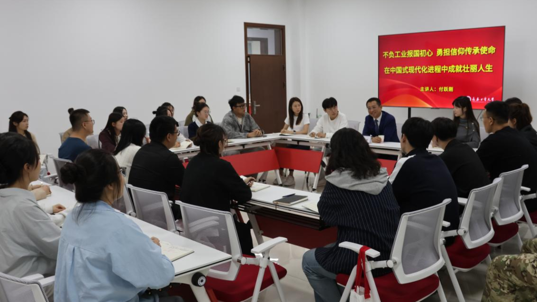 硕士研究生讲授了一堂立意高远、内涵丰富、深刻生动的思想政治理论课。付跃刚对同学们提出三点期望:一要勤于思考,勇于实践,在知行合一中练就过硬本领;二要敏锐洞察,拥抱变革,善于运用先进工具,在智能化浪潮中抢占发展先机;三要深植理论,学透悟透,在信仰的传承与践行中勇担时代主力军。课堂气氛热烈,掌声不断,同学们深感振奋,纷纷表示将铭记校长嘱托,砥砺前行,将“工业报国”的初心与“信仰传承”的使命深深融入学习与研究之中,努力为实现中国式现代化贡献青春力量。
