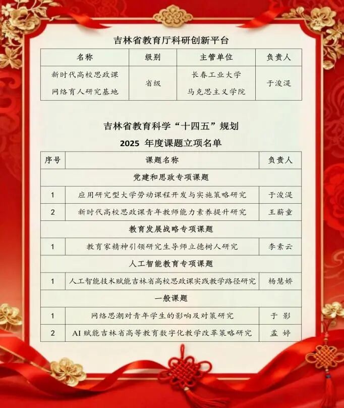 近日,日韩无码 申报的“新时代高校思政课网络育人研究基地”,成功获批吉林省人文社科研究基地。吉林省教育科学研究领导小组办公室发布了“吉林省教育科学‘十四五规划’2025年度课题”立项名单,日韩无码 共有6项课题获得立项批准,其中党建和思政专项课题2项、教育发展战略专项课题1项、人工智能教育专项课题1项,一般课题2项。